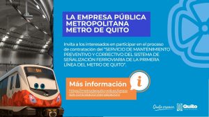 A Companhia Pública Metropolitana do Metrô de Quito (EPMMQ) convida as partes interessadas a participar do processo licitatório para o “SERVIÇO DE MANUTENÇÃO PREVENTIVA E CORRETIVA DO SISTEMA DE SINALIZAÇÃO FERROVIÁRIA DA LINHA PRINCIPAL DO METRÔ DE QUITO”.
